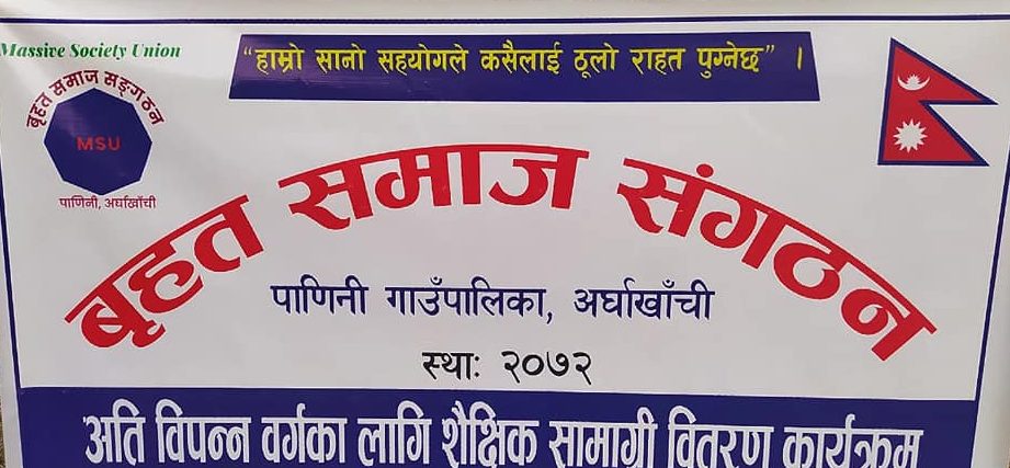 बृहत समाज संगठनद्वारा आयोजित अति बिपन्न वर्गका लागि शैक्षिक सामाग्री वितरण गरिएको छ । संगठनका अध्यक्ष छविलाल कोइराला , शैक्षिक सामाग्री वितरणका संस्थापक संयोजक कमल भट्टराई र संस्थापक सचिव बिनोद पौडेल लगायत बिधालय प्राध्यापक साथै शिक्षक शिक्षिका लगायत विद्यार्थीको उपस्थितिमा बिपन्न र अभिभावक बिहिन विद्यार्थीलाई सहयोग गरिएको हो ।