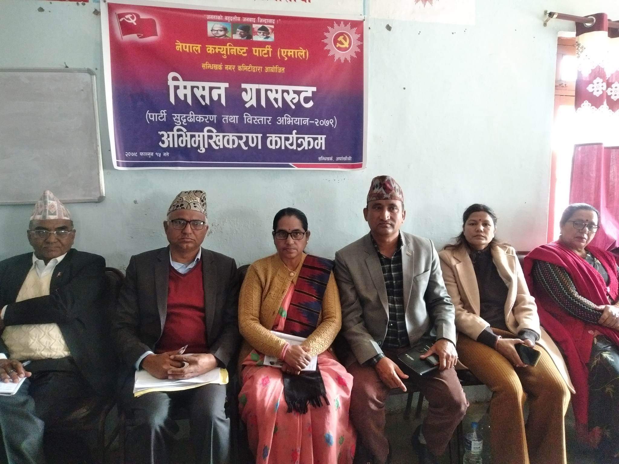नेकपा एमाले सन्धिखर्क नगर कमिटीका अध्यक्ष श्रीकृष्ण भुसालको अध्यक्षता,सचिव कुशल भुसालको संचालन र उपसचिव लक्ष्मण पराजुलीको स्वागत मन्तव्यमा सम्पन्न कार्यक्रममा नेकपा एमाले लुम्बिनी प्रदेश कमिटीका सदस्य दलबहादुर भट्टराई ,ध्रुव पाण्डे ,सरिता भुसाल ,जिबलाल घिमिरे ,शुष्मा खनाल ,जिल्ला कमिटीका उपाध्यक्ष ईश्वरा पोख्रेल ,उपसचिव शम्भुप्रसाद पोख्रेल ,जिल्ला कार्यालय सचिव लिलबहादुर बि.क.,एमाले क्षेत्रीय समन्वय कमिटी प्रदेश (क) का संयोजक रामबहादुर रायमाझी (ख), सन्धिखर्क नगरपालिकाका नगर प्रमुख कृष्णप्रसाद श्रेष्ठ ,उपप्रमुख मिश्रा आचार्य ,नेकपा एमालेका नेताहरू मोतिजङ्ग रायमाझी ,कृष्णबहादुर भुसाल , ध्रुव आचार्य ,नारायण अर्याल ,दिपा आचार्य ,शुष्मा श्रेष्ठ ,देवी भुसाल ,कमला भण्डारी खनाल लगायतका वक्ताहरूले मन्तव्य राख्दै मिसन ग्रासरुट अभियानले नेकपा एमालेलाई थप बलियो र संगठित गर्ने बताउनुभयो ।