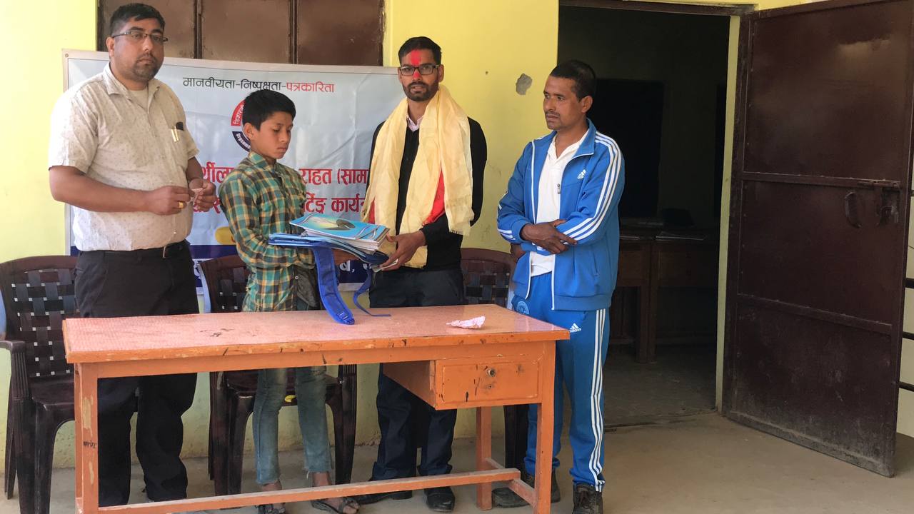 पाणिनि पालिका वडा नं ३ स्थित दुर्वाशेस्वर माध्यमिक विद्यालय परिसमा सम्पन्न हस्तान्तरण कार्यक्रममा डिआरजी सुमन फ़ैन्स कल्व नेपाल का महासचिव नेत्र वहादुर नेपाली,विद्यालयका प्रधानाध्यापक विक्रम सुनार,विद्यार्थी मनोज नेपाली,शिक्षक संकर प्रसाद घिमिरे र स्वतन्त्र पत्रकार डिआरजी सुमनको उपस्थिति रहेको थियो । अति विपन्न विद्यार्थीलाई शैक्षिक सामग्री उपलब्ध गराएकोमा प्रधानाध्यापक सुनारले धन्यवाद ज्ञापन गर्नु भएको छ । जन्मदिन मनाउने नाममा महंगो होटलमा केक काटेर फजुल खर्च गरी रमाउनु भन्दा यसरी विपन्न तथा अनाथ को लागी केही सहयोग गर्न सकेमा प्रभावकारी हुने भएकोले आफुले यसरी जन्मदिन मनाएको शिक्षक संकर घिमिरेले वताउनु भएको छ ।