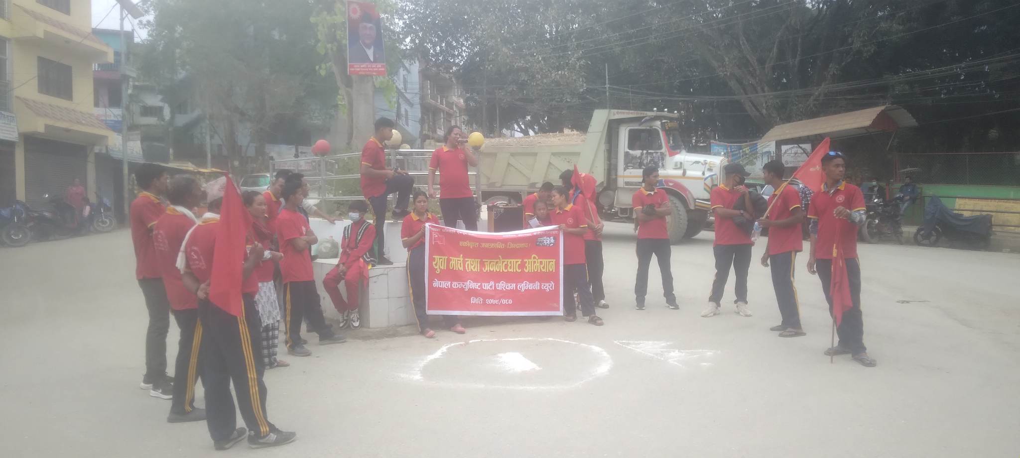 बिप्लब नेतृत्वको नेपाल कम्युनिस्ट पार्टीकाे भातृ सगठन युवा संगठन नेपाल लुम्बिनी प्रदेश पश्चिम व्युराेकाे मार्च पास तथा जनभेटघाट कार्यक्रम अर्घाखाँची जिल्लाकाे सन्धिखर्क नगरपालिका सन्धिखर्क बजारका चाेकचाेक गल्लि गल्लीमा मार्च पास सहित टुडिखेलमा सरसफाइ कार्यक्रम गरि शान्तिबगैचा र भत्तिटाेलामा काेणसभा गरि सम्पन्न भएको छ।