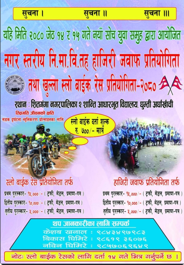 झनक केशी-अर्घाखाँची जिल्ला शितगंगा नगरपालिका २ घुम्तीमा नगर स्तरीय हाजिर जवाफ तथा खुल्ला स्लो वाइक रेस प्रतियोगिता हुने भएको छ । नयाँ सोच युवा क्लब द्वारा आयोजित प्रतियोगिता यहि जेठ १४ र १५ गते हुने भएको छ।
